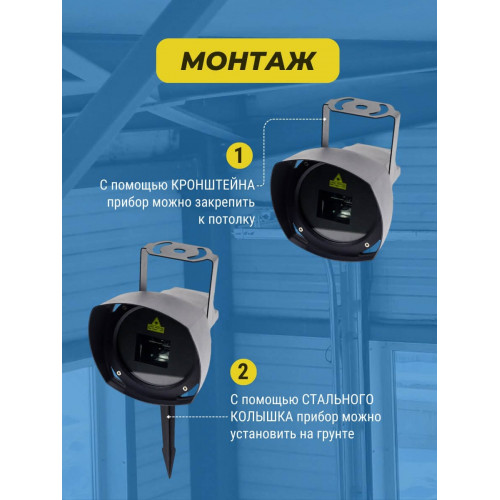 Прибор можно разместить внутри здания, для этого его лучше расположить на высоте полета птиц, например, под крышей. Просто прикрепите изделие к потолку на металлический кронштейн и отрегулируйте угол наклона корпуса. Второй способ установки — размещение прибора на открытой местности. В этом случае его также можно закрепить на возвышении (столб, забор и т.д.) или воспользоваться комплектным колышком. Вкопайте его в землю и зафиксируйте на нем отпугиватель. После установки включите прибор в сеть 220 В и с помощью пульта установите время работы по таймеру.
