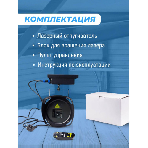 Прежде, чем устанавливать прибор закрепите на его корпусе электронный блок для вращения. Затем конструкцию необходимо зафиксировать на высоте полета птиц, например, под крышей здания. Включите отпугиватель в розетку 220 В. Пульт ДУ поможет включать и выключать прибор в нужное время, а также установить таймер автоотключения. Никаких других настроек отпугиватель не требует. Он работает по заложенному алгоритму, который включает в себя свыше 100 шаблонов генерации лазерной проекции. Лучи отражаются от стен, потолка и других твердых поверхностей и переплетаются между собой. В результате лазерная проекция всегда получается разной.