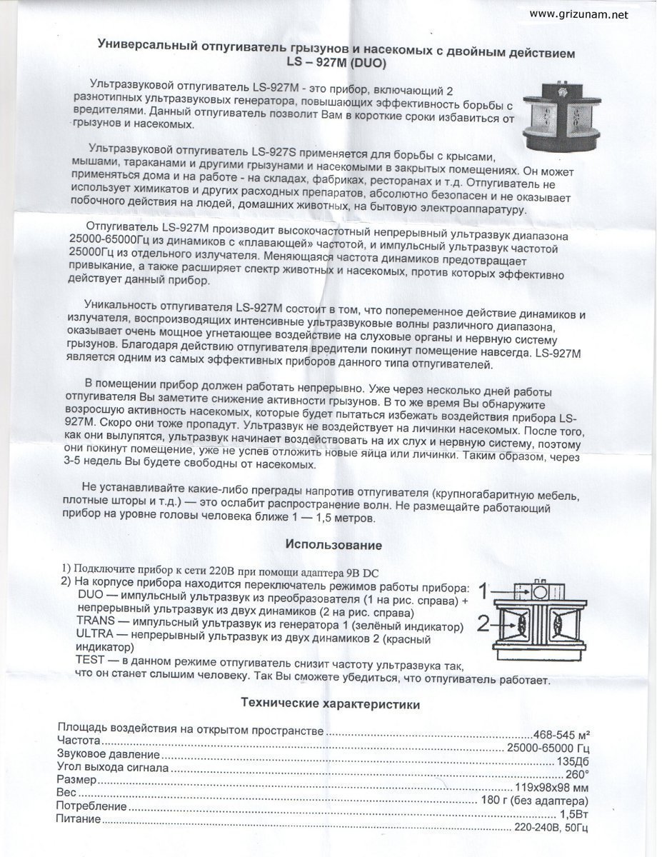 - Безопасность — сотрудники www.grizunam.net отмечают, что устройство работает без применения химикатов, а значит, не представляет никакой опасности для людей и домашних животных. Прибор требует соблюдения тех же правил техники безопасности, что и любой другой электроприбор с питанием от городской электросети. Единственное ограничение при работе с отпугивателем состоит в том, что его не рекомендуется включать рядом с домашними грызунами (хомячками, декоративными крысами и мышами), т.к. у них он вызывает стресс точно так же, как и у диких.